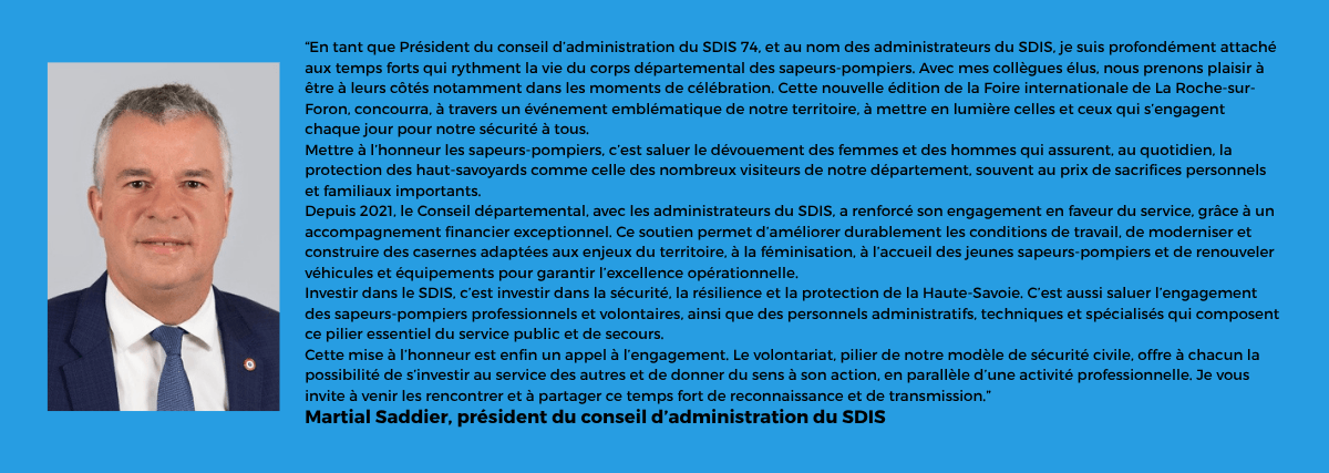 L’année 2026 s’inscrit dans la continuité d’une dynamique déjà engagée depuis plusieurs années : moderniser, adapter et renforcer le Service Départemental d’Incendie et de Secours (SDIS) de la Haute-Savoie pour répondre aux enjeux actuels et futurs. Cette année revêt une dimension particulière, puisque les sapeurs-pompiers participent pour la quatrième fois consécutive à la Foire de Rochexpo, avec une place d’honneur : celle d’invités d’exception de cette édition. Cette reconnaissance témoigne de l’ancrage profond du corps départemental des sapeurs-pompiers dans la vie locale et de la confiance que lui accordent les Haut-Savoyards. Dans 6 mois, Rochexpo accueillera le Mondial Secours & Protection : 3 jours de partage entre le 30 septembre et le 2 octobre 2026, au cœur du département.